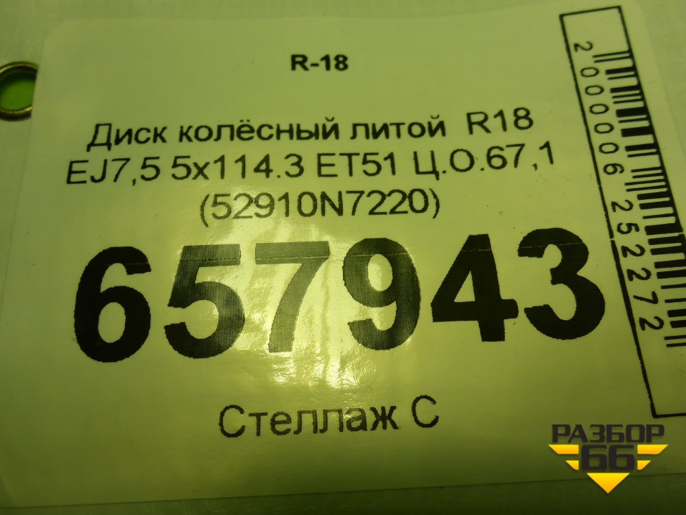 Диск колёсный литой R18 EJ7,5 5x114.3 ET51 Ц.О.67,1 (52910N7220) в Челябинске