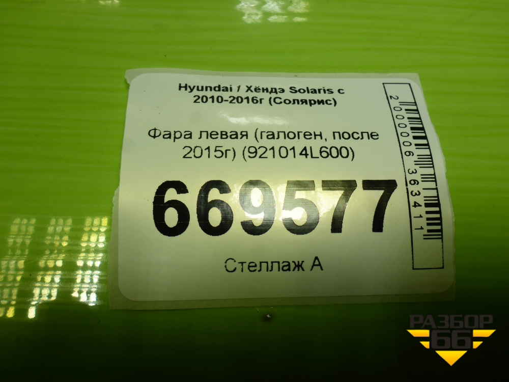 Фара левая (после 2014г галоген) (921014L600) для Hyundai Solaris с 2010-2016г (Солярис) в Челябинске