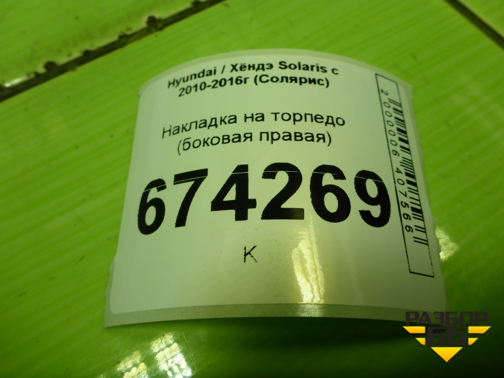 Накладка на торпедо (боковая правая) (847664L000) для Hyundai Solaris с 2010-2016г (Солярис) в Челябинске