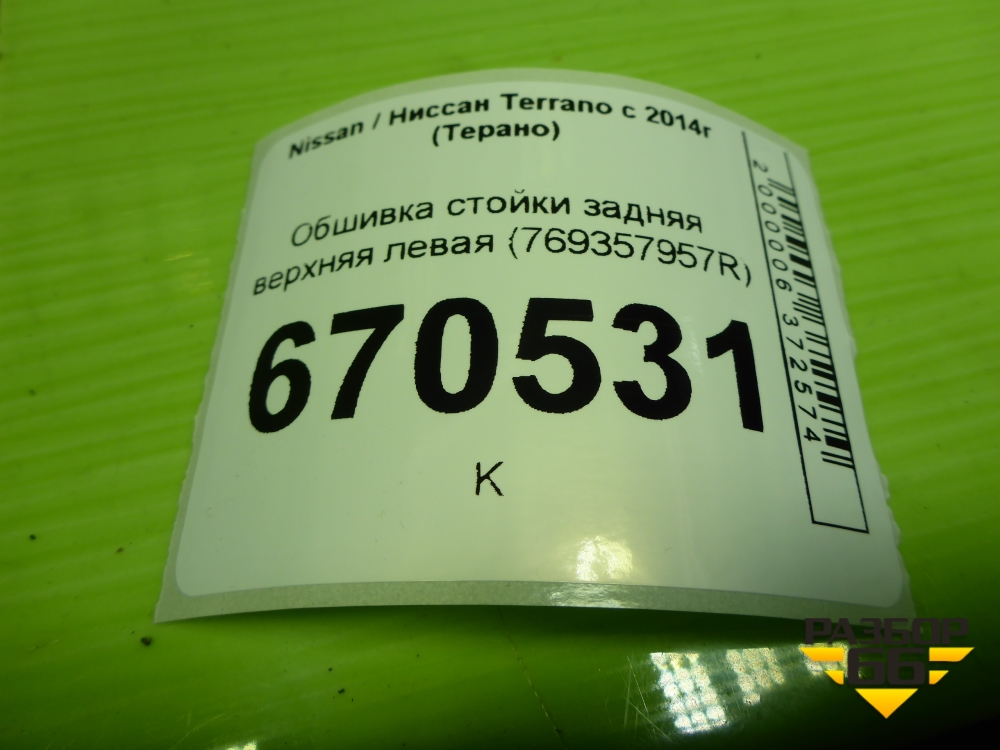 Обшивка стойки задняя верхняя левая (769357957R) для Nissan Terrano с 2014г (Терано) в Челябинске