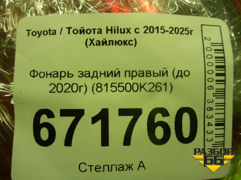 Фонарь задний правый (до 2020г) (815500K261) для Toyota Hilux с 2015-2025г (Хайлюкс) в Челябинске