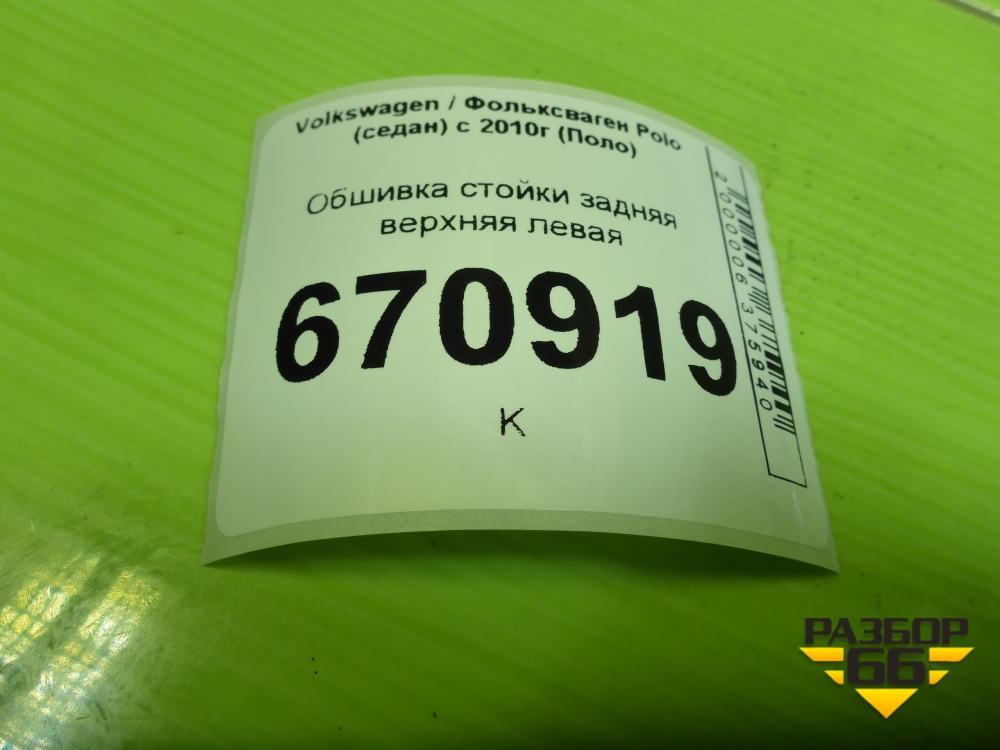 Обшивка стойки задняя верхняя левая (6RU867287) для Volkswagen Polo (седан) с 2010г (Поло) в Челябинске